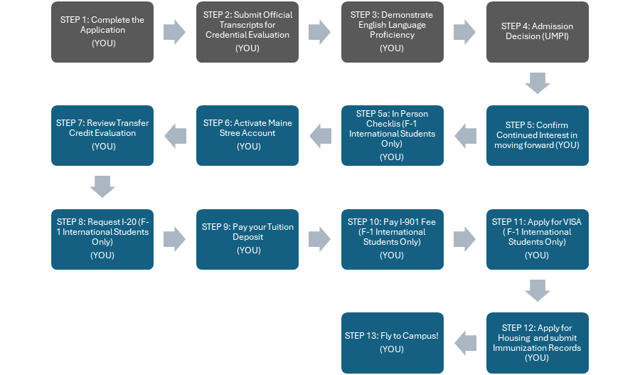 Congratulations on your acceptance to UMPI! Please see below for next steps now that you have been accepted (the ones in blue). If you have any questions, please contact umpi-admissions@maine.edu.