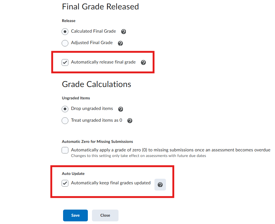 Screenshot of grade settings with automatically release final grade and automatically keep final grades updated highlighted